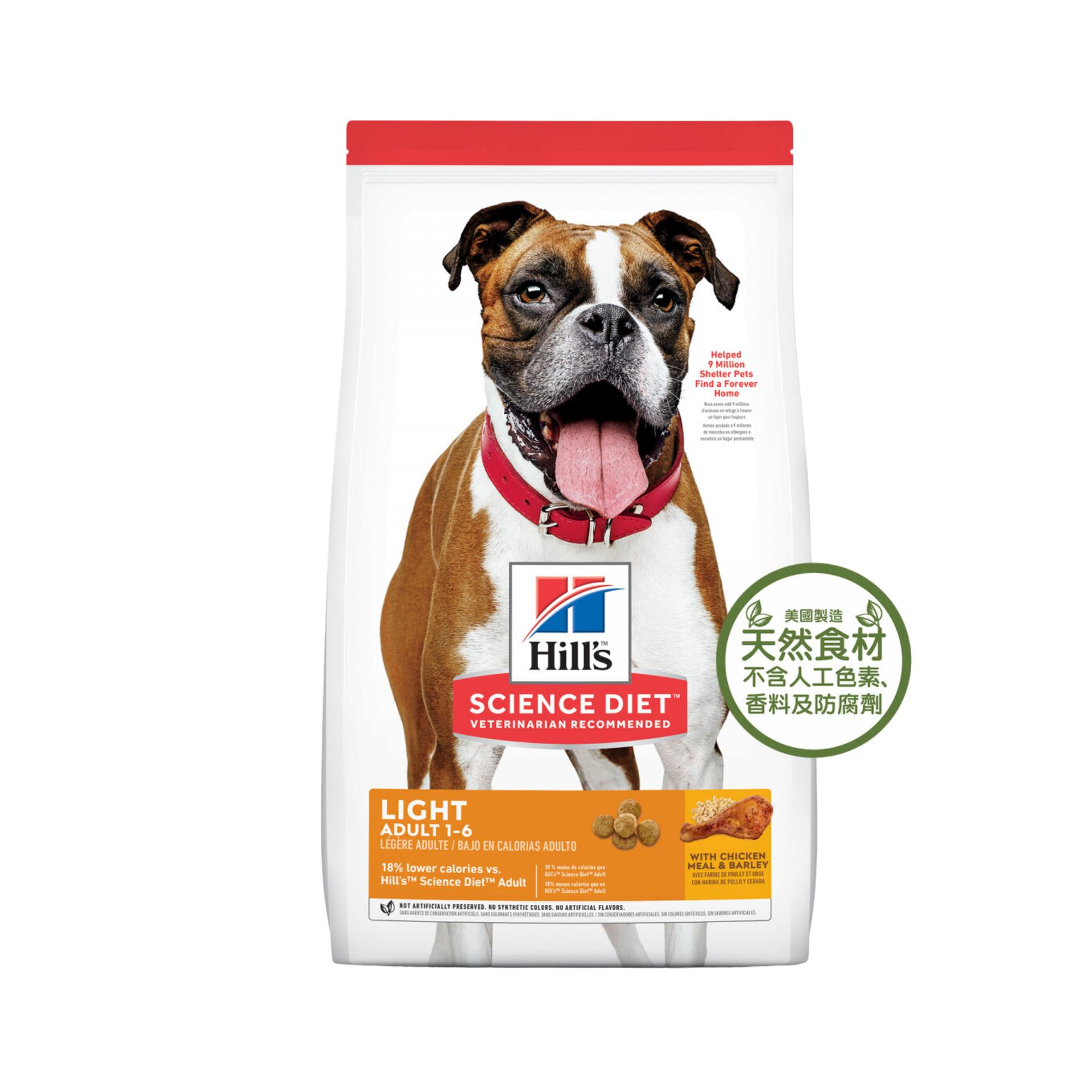 成犬胃口大不代表非得餵食高卡路里的食物。希爾思寵物食品成犬減肥乾糧精確的營養配方適合活動量較少、需要低熱量飲食的成犬,有助於維持健康體重和生活型態。此款優質犬用食品以天然食材製成,提供左旋肉酸素,有助於維持愛犬的心臟功能。內含的維他命E和omega-6滋潤皮膚和毛髮,優良蛋白質和天然纖維在正餐間隔可維持飽足感。